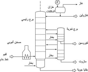 2- أبراج التجزئة: يتألف برج التجزئة من عدة طبقات تسمى صواني ولها أنابيب بخارية تحتوي على فتحات تسمح بخروج البخار، ويختلف عدد الصواني حسب نوع الفصل ونوع المادة. إذ يدخل اللقيم إلى الثلث السفلي لبرج التجزئة الوارد من مخرج المسخن الأنبوبي (الذي تبخر منه القسم الأكبر تحت الضغط الجوي) على شكل مزيج غاز مميع.