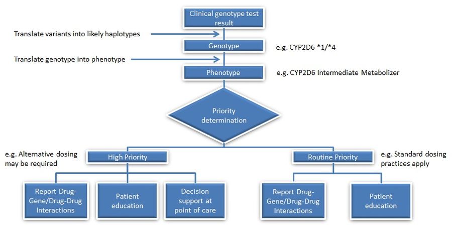 An overall process of how pharmacogenomics functions in a clinical practice. From the raw genotype results, this is then translated to the physical trait, the phenotype. Based on these observations, optimal dosing is evaluated.[7]