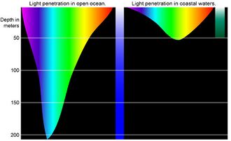 Comparison of the depths which different colors of light penetrate open ocean waters and the murkier coastal waters. Water absorbs the warmer long wavelengths colours, like reds and oranges, and scatter the cooler short wavelength colours.[10]