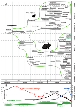 Ochotonids appeared in Asia between the late Eocene and the early Oligocene, and continued to develop along with increased distribution of C3 grasses in previously forest dominated areas under the "climatic optimum" from the late Oligocene to middle Miocene. They thrived in Eurasia, North America, and even Africa. The peak of their diversity occurred during the period from the early Miocene to middle Miocene. Most of them became extinct during the transition from the Miocene to Pliocene, which was accompanied by an increase in diversity of the leporids. It has been proposed that this switch between ochotonids and larger leporids was caused by expansion of C4 plants (particularly the Poaceae) related to global cooling in the late Miocene, since extant pikas reveal a strong preference for C3 plants (Asteraceae, Rosaceae, and Fabaceae, many of them C3). Replacement of large areas of forests by open grassland first started probably in North America and is called sometimes "nature's green revolution".[1]