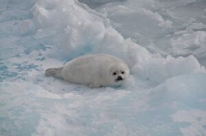 Almost all pinnipeds have fur coats, the exception being the walrus, which is only sparsely covered. Even some fully furred species (particularly sea lions) are less furry than land mammals. Fur seals have lush coats consisting of an undercoat and guard hairs.[33] In species that live on ice, young pups have thicker coats than adults. The individual hairs on the coat, known collectively as lanugo, can trap heat from sunlight and keep the pup warm.[34] Pinnipeds are typically countershaded, and are darker colored dorsally and lighter colored ventrally, which serves to counter the effects of self-shadowing caused by light shining over the ocean water. The pure white fur of harp seal pups conceals them in their Arctic environment.[35] Several species have clashing patterns of light and dark pigmentation.[25][35] All fully furred species molt; the process of which may be quick or gradual depending on the species.[36] Seals have a layer of subcutaneous fat, known as blubber, that is particularly thick in phocids and walruses.[25][34] Blubber serves both to keep the animals warm and to provide energy and nourishment when they are fasting. It can constitute as much as 50% of a pinniped's mass. Newborn pups have a thin layer of blubber, but some species compensate for this with thick lanugos.[34]