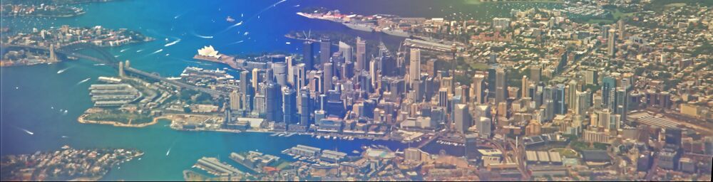 Sydney Harbour and Port Jackson displaying aerial views of the Sydney Harbour Bridge and the Sydney Opera House. The CBD is located to the far left of the photo.