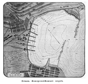In 1872, Alexander II issued a royal decree, appointing a committee to research and locate proper sites for new sea ports at the Black Sea coast. In 1874, the committee reported that because of the strong bora winds the Tsemes Bay could serve as the main port, thus it was advised to be used for the construction of a cabotage port. Several alternative projects were offered but never implemented.[23] The proximity of Vladikavkaz Railway played a decisive role in site choice, it was planned to connect the bay with the inland transport chains via future Tikhoretsk — Novorossiysk conjunction.[24] The Imperial Ministry of Railways offered several projects of the future port to the State Council. The approved project's construction required 3.5 mln roubles, while the planned cargo turnover was estimated at 30 mln poods.[16][18][23][25]