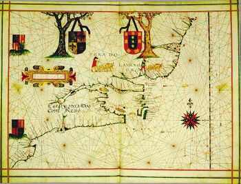 Based on the terms defined in the Treaty of Tordesillas, the Portuguese Crown claimed it had territorial rights in the area visited by the explorer John Cabot in 1497 and 1498 on behalf of the Crown of England.[1] To that end, in 1499 and 1500, the Portuguese mariner João Fernandes Lavrador visited the northeast Atlantic coast and Greenland, which accounts for the appearance of "Labrador" on topographical maps of the period.[2] Subsequently, in 1501 and 1502, the Corte-Real brothers explored and charted Greenland and what is today the Canadian province of Newfoundland and Labrador, claiming these lands as part of the Portuguese Empire. Fragmentary evidence also suggests a previous expedition in 1473 by João Vaz Corte-Real, their father, with other Europeans, to Terra Nova do Bacalhau (New Land of the Codfish) in North America.[2][3] The possible voyage of 1473 and several other possible pre-Columbian expeditions to North America in the 15th century, mostly from the Azores in the case of the Portuguese (included in donation royal letters), remain matters of great controversy for scholars. Their existence is based on brief or fragmentary historical documents that are unclear concerning the destinations of voyages.