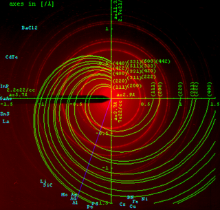 نمط مسحوق الإلكترون (بالأحمر) لآل فيلم ذو غطاء fcc ملتف (بالأخضر) وخط التقاطعات (بالأزرق) الذي يحدد المتغير الشعري.[1]