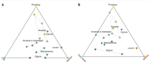In their archaeogenetics study, Lazaridis et al. (2022)[17] carried out principal components analysis (PCA), projecting the ancient individuals onto the variation of present-day West Eurasians. They discovered that Neolithic Cypriots genetically clustered with Neolithic Anatolians. Two main clusters emerge: an “Eastern Mediterranean” Anatolian/Levantine cluster that also includes the geographically intermediate individuals from Cyprus, and an “inland” Zagros-Caucasus-Mesopotamia-Armenia-Azerbaijan cluster. There is structure within these groupings. Anatolian individuals group with each other and with those from Cyprus, whereas Levantine individuals are distinct.[17]
