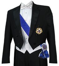 A special and rarely granted award, called the Presidential Medal of Freedom with Distinction,[16] has a larger version of the same badge, which is worn as a star on the left chest. It comes with a sash that is worn over the right shoulder (similarly to the Grand Cross of an order of chivalry), with its rosette (blue with a white edge, bearing the central disc of the badge at its center) resting on the left hip. When the medal with Distinction is awarded, the star may be presented hanging from a neck ribbon and can be identified by its size, which is larger than the standard badge.