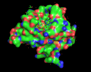 Propioyl-CoA interacting with active catalytic site of Gen5. Gen5 is shown using space-filling model balls while propionyl-CoA is shown as a stick model, found in the middle of the complex.