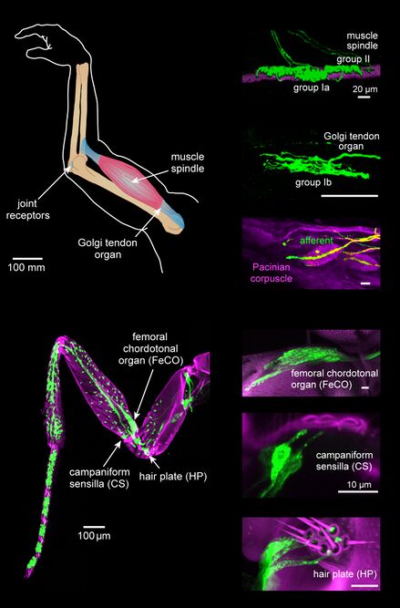 لتحديد الحمل على أحد الأطراف ، تستخدم الفقاريات الخلايا العصبية الحسية في أعضاء جولجي الوترية:[9] عصبون وارد من النوع Ib. يتم تنشيط هذه المستقبِلات الحسية العميقة عند قوى عضلية معينة ، مما يشير إلى المقاومة التي تعاني منها العضلات. وبالمثل ، تمتلك اللافقاريات آلية لتحديد حمل الأطراف: الحسية الكامبانية الشكل.[10] تنشط هذه المستقبِلات عندما يواجه أحد الأطراف مقاومة.