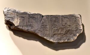 خراطيش ونصوص الأهرام لببي الأول. جزء من كتلة الحجر الجيري من حطام الجدار الشمالي لغرفة الانتظار داخل هرم ببي الأول في سقارة. متحف بتري للآثار المصرية.