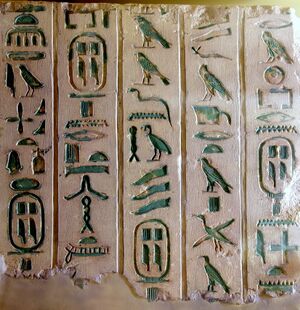 قطعة من نقش ملون مع التعويذة رقم 354 و255 من نصوص الهرم. من هرم بيبي الثاني بسقارة. متحف برلين الجديد.