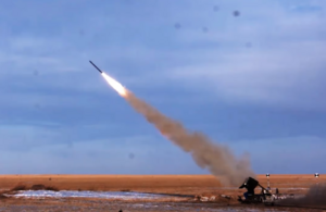 لقطة من ڤيديو بثه تلفزيون الصين المركزي يظهر اعتراض الصاروخ QW-12 لهدف أثناء الاختبارات.
