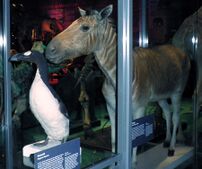 The quagga had disappeared from much of its range by the 1850s. The last population in the wild, in the Orange Free State, was extirpated in the late 1870s.[11] The last known wild quagga died in 1878.[32] The specimen in London died in 1872 and the one in Berlin in 1875. The last captive quagga, a female in Amsterdam's Natura Artis Magistra zoo, lived there from 9 May 1867 until it died on 12 August 1883, but its origin and cause of death are unclear.[13] Its death was not recognised as signifying the extinction of its kind at the time, and the zoo requested another specimen; hunters believed it could still be found "closer to the interior" in the Cape Colony. Since locals used the term quagga to refer to all zebras, this may have led to the confusion. The extinction of the quagga was internationally accepted by the 1900 Convention for the Preservation of Wild Animals, Birds and Fish in Africa. The last specimen was featured on a Dutch stamp in 1988.[44] The specimen itself was mounted and is kept in the collection of Naturalis Biodiversity Center in Leiden. It has been on display for special occasions.[45]