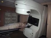 ![]() Radiation therapy of the pelvis, using a Varian Clinac iX linear accelerator. Lasers and a mould under the legs are used to determine exact position. | |