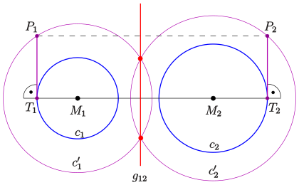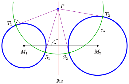 For two non intersecting circles , there can be drawn two equipower circles , which have the same power with respect to (see diagram). In detail: . If the power is large enough, the circles have two points in common, which lie on the radical axis .