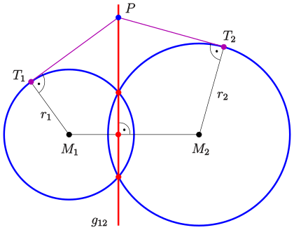 For two circles c1, c2 with centers M1, M2 and radii r1, r2 the powers of a point P with respect to the circles are
