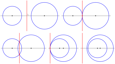 If radius is given, from this equation one finds the distance to the (fixed) radical axis of the new center. In the diagram the color of the new circles is purple. Any green circle (see diagram) has its center on the radical axis and intersects the circles orthogonally and hence all new circles (purple), too. Choosing the (red) radical axis as y-axis and line as x-axis, the two pencils of circles have the equations:
