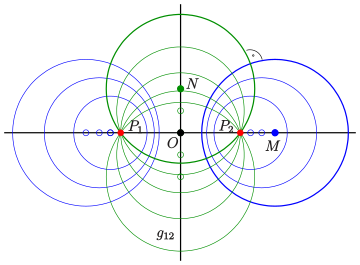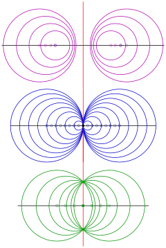 b) In electromagnetism coaxal circles appear as field lines.[11]