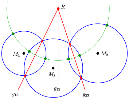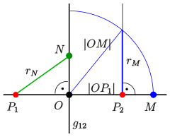 3. In order to draw a circle of the second pencil (in diagram blue) with center on , one determines the radius applying the theorem of Pythagoras: (see diagram).