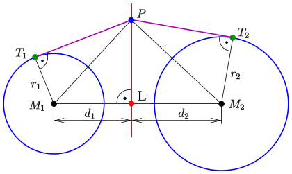 If point P is outside the circles, P has equal tangential distance to both the circles.