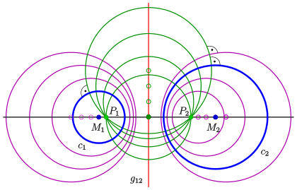 a) Any two green circles intersect on the x-axis at the points , the poles of the orthogonal system of circles. That means, the x-axis is the radical line of the green circles.