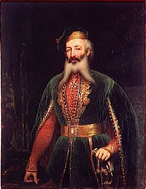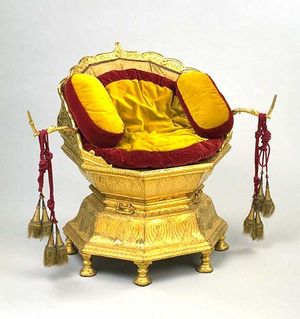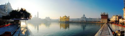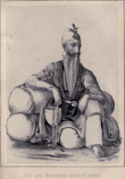 ![]() رانجيت سنغ يجلس على عرشه الذهبي في قلعة لاهور في كامل دروعه. | |||||