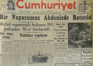 : CS1 maint: unrecognized language (link) - ^ "Turkish Ship Torpedoed". The Calgary Herald. 26 June 1941. Retrieved 14 May 2011.