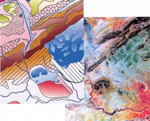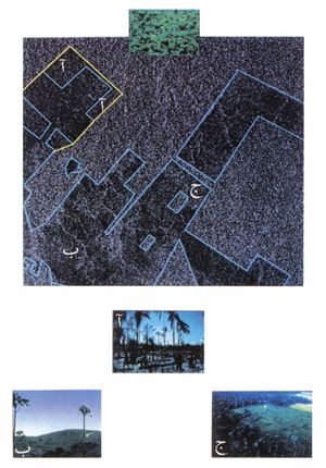 أما التنقيب عن النفط فهو يشمل مساحات واسعة كانت الشركات تحتاج في أثنائه إلى آلاف الصور الجوية الملتقطة من الطائرات، مما يسبب مصاعب جمة ويتطلب وقتاً طويلاً ومن ثم تكاليف باهظة. وتشير الصور الفضائية إلى مناطق الأمل النفطية (في الأحواض الرسوبية والاتجاهات البنيوية والفوالق وغيرها) مما يمكن عن طريقها توجيه أعمال التنقيب. وأجهزة الاستشعار التي تحملها السواتل تمكن من تحديد نسب المعادن في الصخور كالحديد وغيره، وتساعد في مجالاتها الطيفية المتعددة على استشكاف الخامات المعدنية المختلفة كالمعادن الملونة واللاتريت والبوكسيت والكبريت والفوسفات وغيرها (الشكل 16).