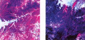 كذلك يظهر الماء الصافي على الصورة باللون الكحلي في حين يظهر الماء العكر باللون الأزرق، وكلما ازدادت كمية العكر زاد لمعان اللون الأزرق، لأن الماء الصافي يمتص جميع الأشعة الساقطة أو تخترقه إلى الأعماق، في حين تعكس المواد المعلقة في الماء والمسببة للعكر نسبة معينة من الأشعة تزداد مع ازدياد العكر، ويمكن بالاعتماد على ذلك معرفة التغيرات التي تطرأ على مياه المجاري الموسمية والأنهار. تحليل الصور الحرارية: الصور الحرارية هي الصور المحضرة من المعطيات المسجلة ضمن النطاق الطيفي تحت الأحمر البعيد أو الحراري، وقد استخدم التصوير الحراري بنجاح في الكثير من المجالات مثل الجيولوجية، لتحديد أنواع الصخور وتركيبها وتحديد مناطق الفوالق الجيولوجية، وكذلك تحديد أنواع الترب ورطوبة التربة وتحديد الخواص الحرارية للبراكين وتحديد أماكن الينابيع الحارة ومراقبة خرائط الغابات. عند تحليل الصور الحرارية ليس من الضروري معرفة درجة حرارة المواد المصورة، ولكن يمكن الموازنة بينها نسبياً للتفريق بين مختلف الأجسام الموجودة في الصورة، ويفضل اختيار الوقت المناسب لأخذ الصور الحرارية بما يتناسب وأهداف الدراسة، فعند دراسة منحنيات الإشعاع الحراري للتربة والصخور والماء يلاحظ أن التغيرات الحرارية من الحرارة إلى البرودة يمكن أن توفر معلومات جيدة حول نوع المادة المدروسة وطبيعتها وحالتها.