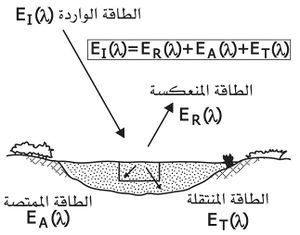 ويتضح سقوط أشعة كهرمغنطيسية على سطح ماء فينعكس جزء من الطاقة الواردة ويمتص جزء آخر وينتقل جزء ثالث. وإذا طبق مبدأ حفظ الطاقة يكون: EI(λ)=ER(λ)+EA(λ)+ET(λ) حيث: EI(λ) = الطاقة الواردة. EA(λ) = الطاقة الممتصة. ER(λ) = الطاقة المنعكسة ET(λ) = الطاقة المنتقلة. وتجدر ملاحظة نقطتين من العلاقة السابقة: أما النقطة الأولى فهي أن أجزاء الطاقة المنعكسة والممتصة والمنتقلة تتغير بتغير الظواهر الأرضية (نبات، ماء، تربة..) تبعاً لتركيب هذه الظواهر وأحوالها، وتسمح هذه الاختلافات بتمييز عدة ظواهر مختلفة على صورتها، وهذا مايسمى بالبصمة الطيفية، وأما النقطة الثانية فهي أنه يرى فيما يتعلق بطول الموجة λ، أن أجزاء الطاقة، المنعكس والممتص والمنتقل، تختلف باختلاف طول الموجة الواردة وذلك تبعاً لكل ظاهرة من الظواهر الأرضية، ومن ثم لايمكن تمييز ظاهرتين في مجال طيف معين، ولكن يمكن تمييز إحداهما من الأخرى عند اختلاف أطوال موجات الأشعة. إن تغير طول الموجة ضمن القسم المرئي من الطيف، يعطي تغيراً في اللون، فمثلاً يقال إن الشيء أزرق عندما يعكس القسم الأزرق من الطيف وهكذا.