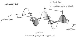 وهنا يتضح انتشار الموجة الكهرمغنطيسية ومركِّباتها جيبياً وبسرعة الضوء C. وتسمى المساحة بين ذروة الموجة والذروة التي تليها طول الموجة λ، ويسمى عدد الذرا المارة بنقطة ثابتة في الفراغ في وحدة الزمن تَردُدَ الموجة f. وعليه يكون C=λ .f حيث C سرعة الضوء وهي ثابتة في الفراغ وتساوي تقريباً 3× 810م/ثا.