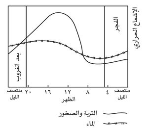 يلاحظ أن المنحنى الإشعاعي الحراري للماء يختلف عن منحنى التربة و الصخور لسببين أولهما أن التغيرات الحرارية للماء قليلة بالموازنة مع اليابسة وثانيهما أن المنحنى يصل إلى الحرارة العظمى بعد ساعتين من وصول منحنيات المواد الأخرى، ونتيجة لذلك تكون درجة حرارة اليابسة أعلى من حرارة الماء في النهار وأقل في الليل، كما أنه عند الصباح والغروب تتقاطع المنحنيات الخاصة بالماء والتربة والصخور، وهذا مايعرف بالتقاطع الحراري، ويدل ذلك على أنه في هذا الوقت يكون الإشعاع الحراري للمواد متقارباً ولاينصح بإجراء التصوير الحراري في هذا الوقت لأنه يصعب التفريق بين المواد على الصورة الحرارية.