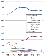 المصادر: 1995-1999, 2006-2009 IMF صند: تشكيلة عملات احتياطيات النقد الأجنبي الرسمية Sources: 1999-2005 ECB: تراكم احتياطيات العملة الصعبة |