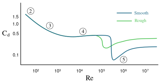 - separated unsteady flow with a laminar boundary layer at the upstream side, before flow separation, with downstream of the sphere a chaotic turbulent wake,