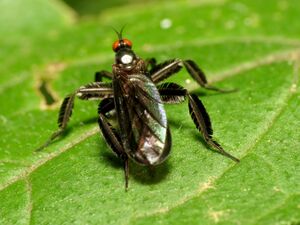 Common to many male Diptera, the dorsal section of the eyes is larger than the ventral section.[2] The lengthened dorsal section, in addition to shortened wings, aids the male's ability to approach the female from beneath during mating.