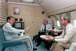 روبرت مكفارلن (يمين) يجلس قبالة الرئيس ريگان وبجانبه كبير موظفي الرئيس، على متن إحدى طائرات القوات الجوية الأمريكية، مايو 1988.