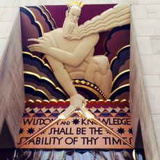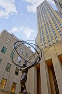 Commissioned in 1936 and executed by Lee Lawrie and Rene Chambellan، تمثال أطلس يقع في باحة المبنى العالمي. It faces eastward toward St. Patrick's Cathedral on Fifth Avenue. The statue depicts أطلس the titan, with exaggerated muscles, supporting the celestial vault on his shoulders.[11][12]