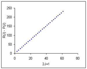 Plot of the differences R(J)-P(J) as a function of 2J+1 taken from observed data for the fundamental vibration of carbon monoxide[51]