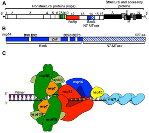 nsp10 | nsp16 و nsp14 عامل مساعد ؛ يشكل متغاير مع كليهما ؛ يحفز نشاط 2-O-MT (nsp16) و ExoN (nsp14) |