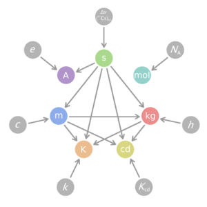 Relations between proposed SI units definitions (in colour) and seven physical constants (in grey) with fixed numerical values in the proposed system. Unlike the current (2013) definition, the base units are derived from one or more constants of nature.
