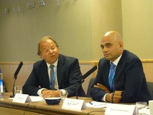 (l-يمين) هوگو بيبر، ساجد جاويد ومارك وورث في عشاء جوائز الأعمال الإسرائيلية البريطانية[4]