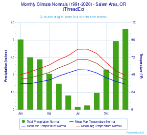 Salem's mean annual temperature is 54.1 °F (12.3 °C);[22] its annual precipitation is 40.08 بوصات (1،018 mm), with an average 3.5 بوصات (8.9 cm) of snow included. However, over a quarter of years receive no snowfall.[22] The state capital is about 47 mi (76 km) south of Portland, but actually has a lower average temperature than that of Portland (54.4 °F أو 12.4 °C),[22] due in part to the lower daily minima.