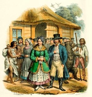 Samogitians lived in western Lithuania and were closely related to Semigallians and Curonians. In 1413, they became the last group of Europeans to convert to Christianity. Samogitians were one of the three main nations of the Grand Duchy of Lithuania, Ruthenia, and Samogitia. In 1857, there were 418,824 people of Samogitian roots and 444,921 persons declared the Samogitian dialect as their mother tongue in 1897 in Kovno Governorate.[3] Currently Lithuania does not allow for declaration of Samogitian nationality in passports as it is not a recognized ethnicity.[4] In list of ethnic groups of Russia there is one person who declared himself with "Zhemaijty".[5]