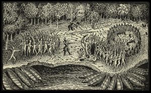 نقش مبنى على رسم قام به شامبلين لرحلته عام 1609. ويصور معركة بين قبائل إيروكوي وألگونكوين، بالقرب من بحيرة شامپلين.
