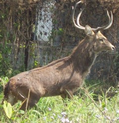 The brow-antlered deer is a medium-sized deer, with uniquely distinctive antlers, measuring 100–110 cm. in length with extremely long brow tine, which form the main beam. The two tines form a continuous curve at right angles to the closely set pedicels. This signifies its name, brow-antlered deer, the forward protruding beam appears to come out from the eyebrow. The antlers of the opposite sides are unsymmetrical with respect to each other. The beams are unbranched initially whereas curvature increases as length increases and they get forked also. The sexes are moderately dimorphic in body size and weight. The height and weight of a fully grown stag may be approximately 115–125 cm at shoulder and 95 to 110 kg (210 to 230 lb) respectively. The height and weight of the female are shorter and less as compared to the male counterpart. The length of the body from the base to the ear up to the tail is about 145 to 155 cm in both sexes. The tail is short and rump patch is not pronounced.