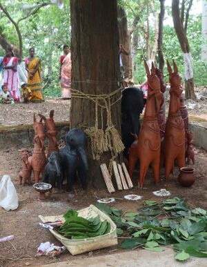 The Santhal people believe in nature worship, and their place of worship is in sacred groves known as Jaher and Sarna, in contrast to Hindu places of worship in temples. They also perform animal sacrifices to honor their gods and accept flesh, including beef and pork, practices that are generally prohibited in Hinduism.[34] Thus they consider themselves believers of Sari and Sarna religion rather than Hinduism. Although there is overlap of ideology, belief, culture and practices in between Sarnasim and Hinduism.[35][36]