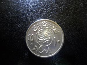 10 هللات | فضي | شعار الدولة، يعلوها لقب (خادم الحرمين الشريفين)،