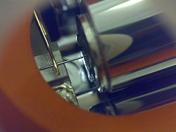 A close-up of a simple scanning tunneling microscope head using a platinum-iridium stylus.