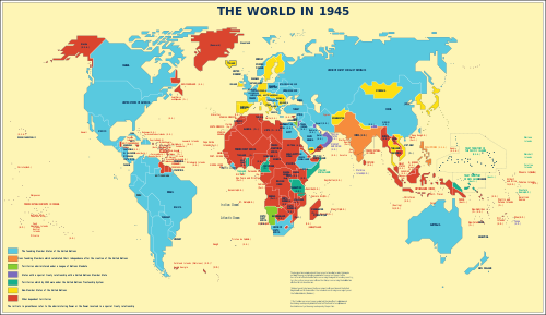 خريطة العالم في 1945، تبين أقاليم مجلس الوصاية التابع للأمم المتحدة بالأخضر[4]
