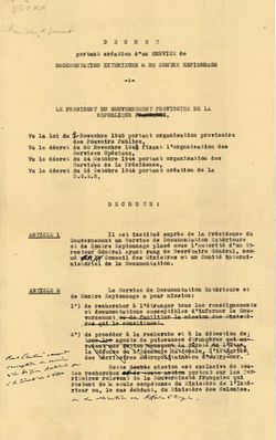 في عهد الجمهورية الرابعة كانت SDECE خاضعة لرئيس المجلس. ومنذ بداية الجمهورية الخامسة وحتى 1962، كانت خاضعة لرئيس الوزراء ميشل دوبريه وكـُرِّست إمكانياتها، لحد كبير، لحرب الجزائر. وإثر قضية المهدي بن بركة، أخضع الجنرال شارل ديگول المصلحة لوزارة الدفاع، وبدأت العسكرة التدريجية للمصلحة.